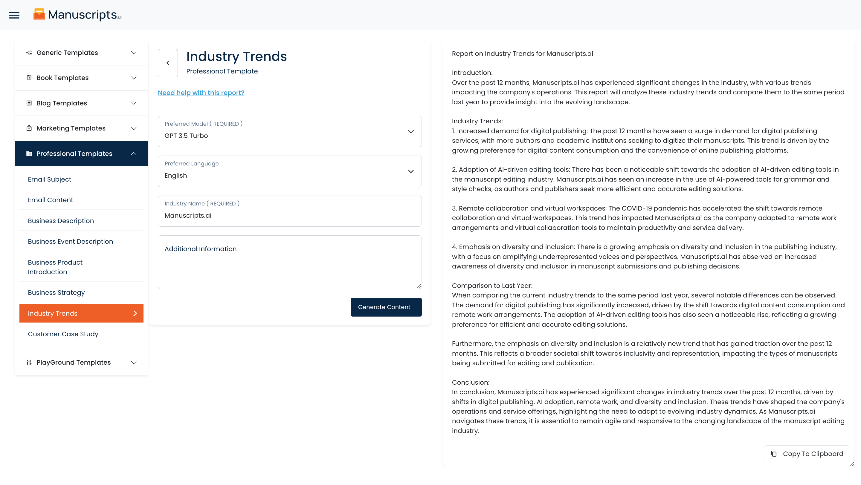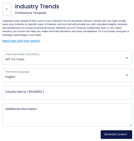 Furthermore, the tool can be customized to track specific keywords, industries, or market segments, allowing businesses to focus on the trends that are most relevant to their operations. Whether it’s tracking the rise of a new technology, understanding shifting consumer preferences, or identifying potential disruptors, the Industry Trends AI tool equips businesses with invaluable insights that drive strategic decision-making and innovation.