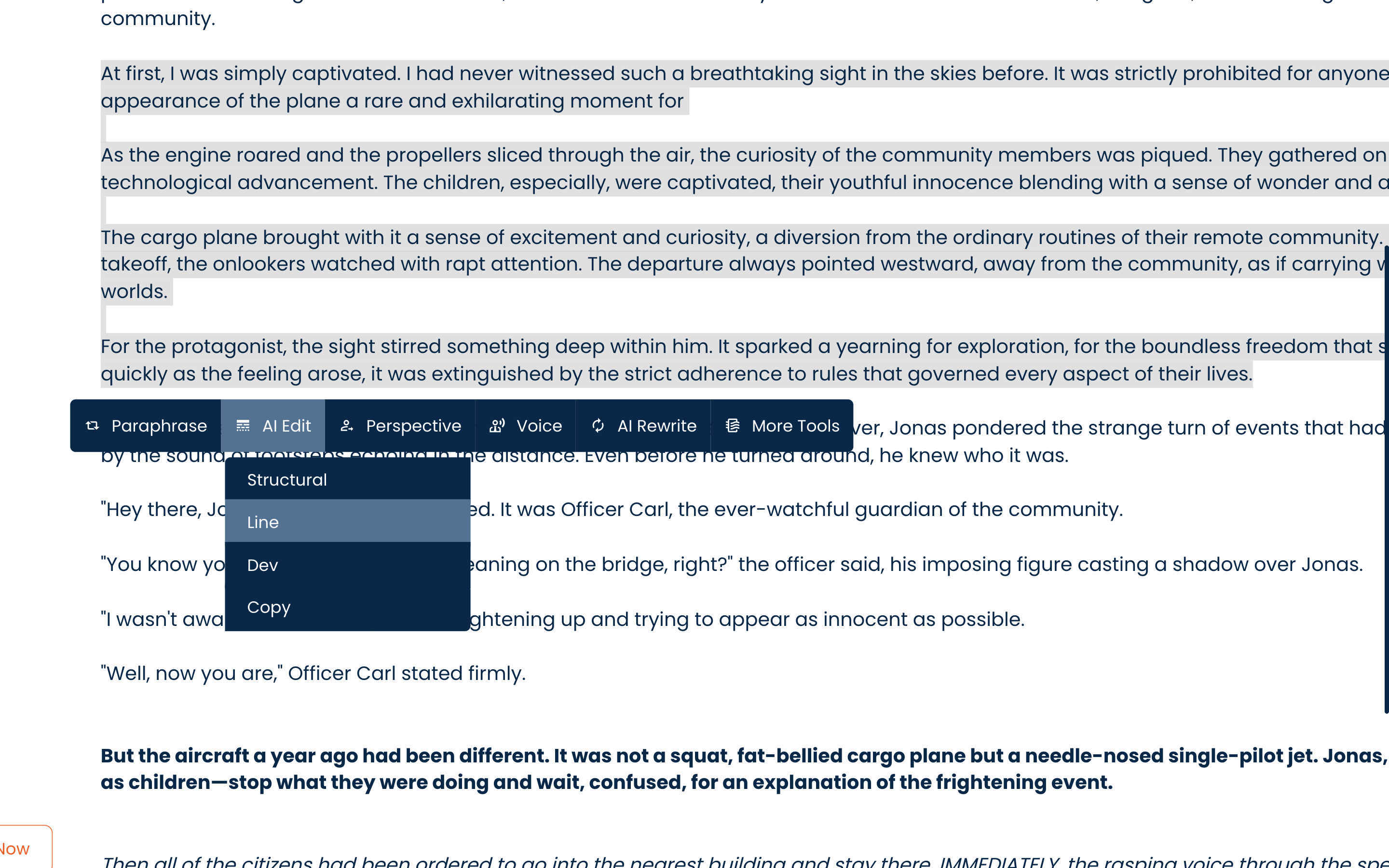 Line edits in AI writing involve carefully reviewing and revising each line of text to enhance clarity, coherence, and overall quality. While traditional editing methods often center on making major structural changes or revisions to content, line edits are more concentrated on refining the finer details of a written piece. This can encompass tasks like correction of grammatical and punctuation errors, enhancing sentence structure, and improving the overall readability of the text. Through this meticulous process, the aim is to ensure that every line contributes to the cohesiveness and impact of the content, ultimately elevating the quality of the writing.