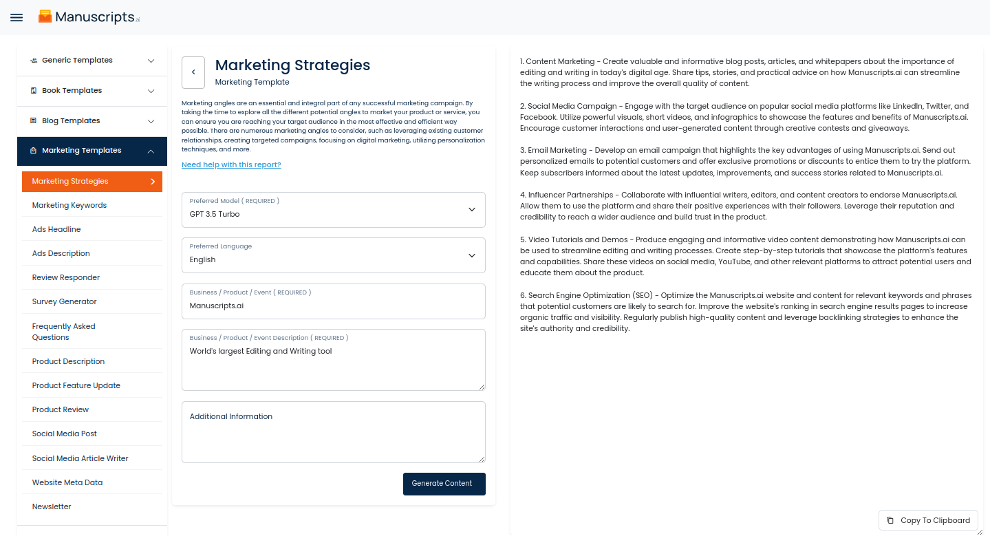 Introducing our state-of-the-art AI-powered marketing strategies tool, designed to revolutionize the way businesses approach their marketing efforts. Our tool combines the power of artificial intelligence and advanced data analytics to provide tailored marketing strategies that are focused on delivering results.
