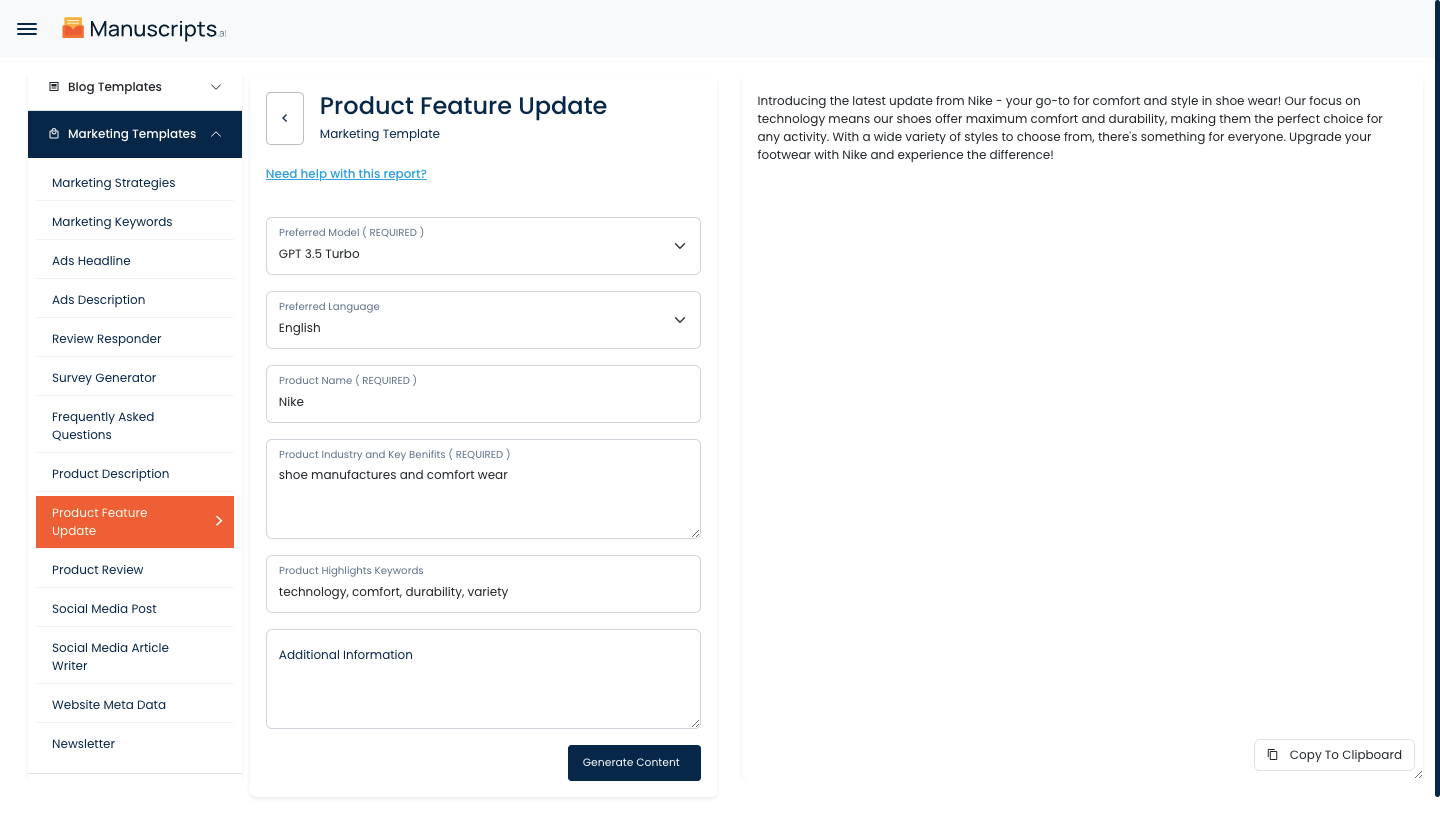 Generate your content by clicking on the Generate Content button.