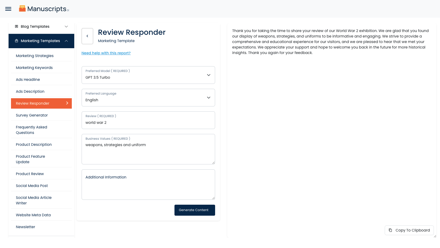 Generate your content by clicking on the Generate Content button.