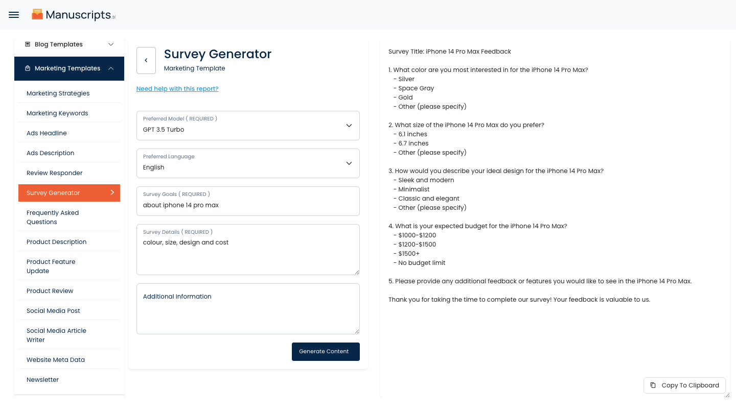 Whether you need to gather customer feedback, conduct market research, or collect employee insights, our Survey Generator AI Tool is the perfect solution. Say goodbye to the hassle of manual survey creation and embrace the power of AI to streamline your surveying process. Try our Survey Generator AI Tool today and experience the difference.