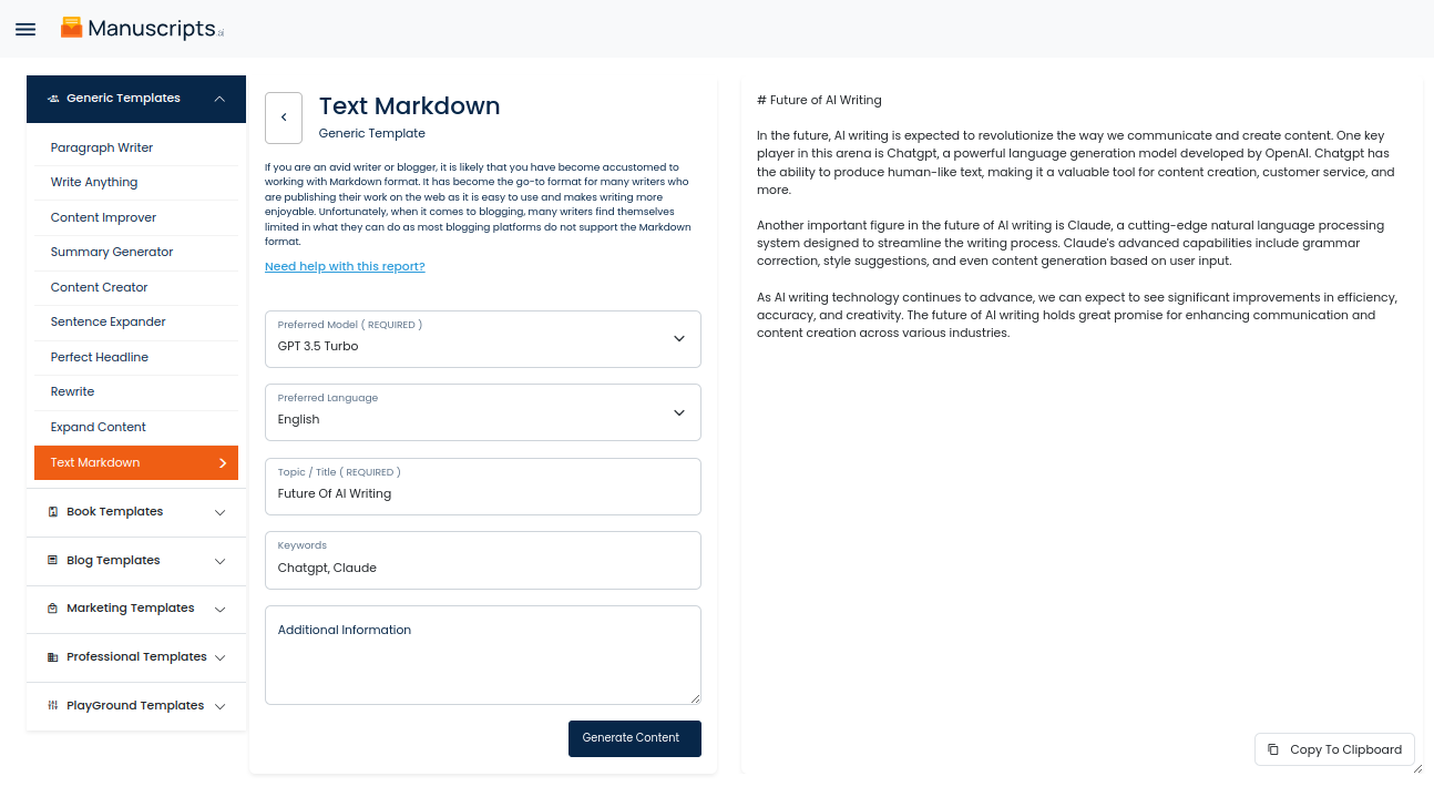 Our Text Markdown is an AI that enables you to get markdown content for your topics quickly and efficiently. With our Text Markdown, you can quickly create blog post markdown that is ready for publishing, eliminating the need for manual markdown conversion.